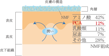 お肌の潤いは、わずか20μm 程度しかない角層に存在する天然保湿因子(NMF) やセラミドなどによって保たれています。私たちは、NMF の中でも特に水分保持機能のキーポイントになる“PCA-Na”に着目しました。